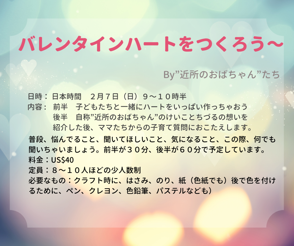 自称”近所のおばちゃん”が、普段、どういう想いで、子どもたちと携わる仕事をしているのか? 子育てが終わった先輩ママの失敗談などの経験や、こども園や日本語教室を通して見る子どもたちの行動などを通しての視点など、お話できることがたくさんあるので、ぜひ、この機会に参加してみてくださいね。